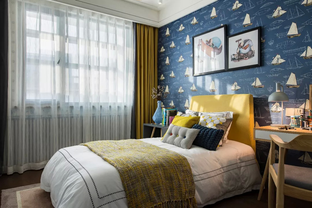 ▲床头背景墙是一幅船队远航的画面,艳黄色的床头靠背,让儿童房显得更为生动活跃。床头一侧配上一张书桌,实用且方便。