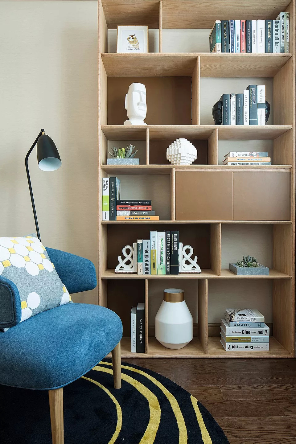 ▲茶几上的花瓶与书籍,结合侧边的蓝色小座椅,带来了一丝丝的文艺气息。