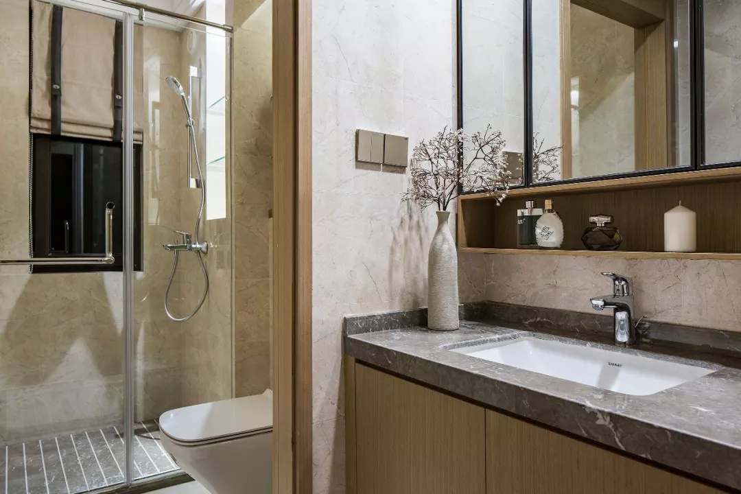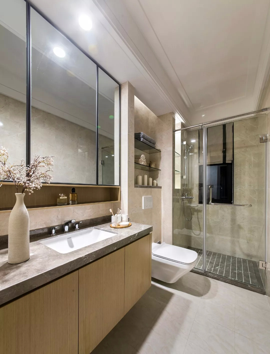▲大面积的镜面柜,配合丰富的入墙式收纳,两个人同时洗漱也不会显得拥挤。
