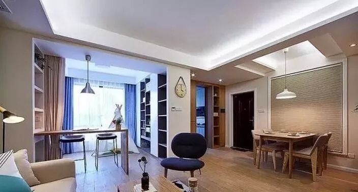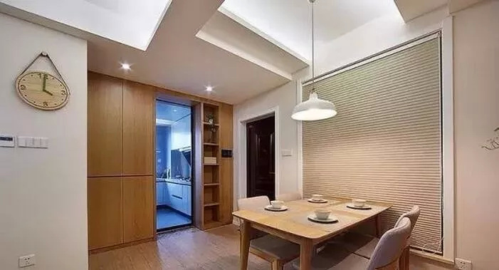 ▲ 开门见餐厅,浅色背景墙,柔和简单的吊灯,原木色餐桌,都给人温暖如春的感觉。