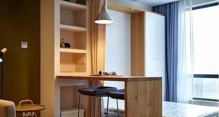 ▲ 开放式书房自然也是作为吧台使用的,一张原木书桌,几把高脚椅,伴随着静谧的灯光,开启悠闲的下午茶时间。