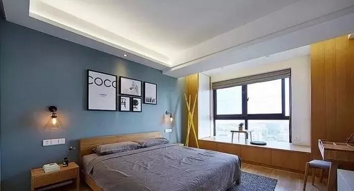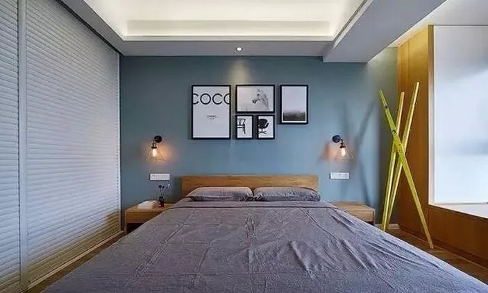 ▲ 深蓝色床头背景墙非常优雅,两盏对称的壁灯用来培养气氛是最好的,搭配深灰色床品,给人由内到外的踏实感和暖意。