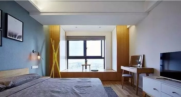 ▲ 飘窗改造成榻榻米,原木日式风情的榻榻米上,放一张小茶几,两三个蒲团,与家人或者同事坐在这,静静欣赏视野开阔的外景,想必内心也能淡然超脱。