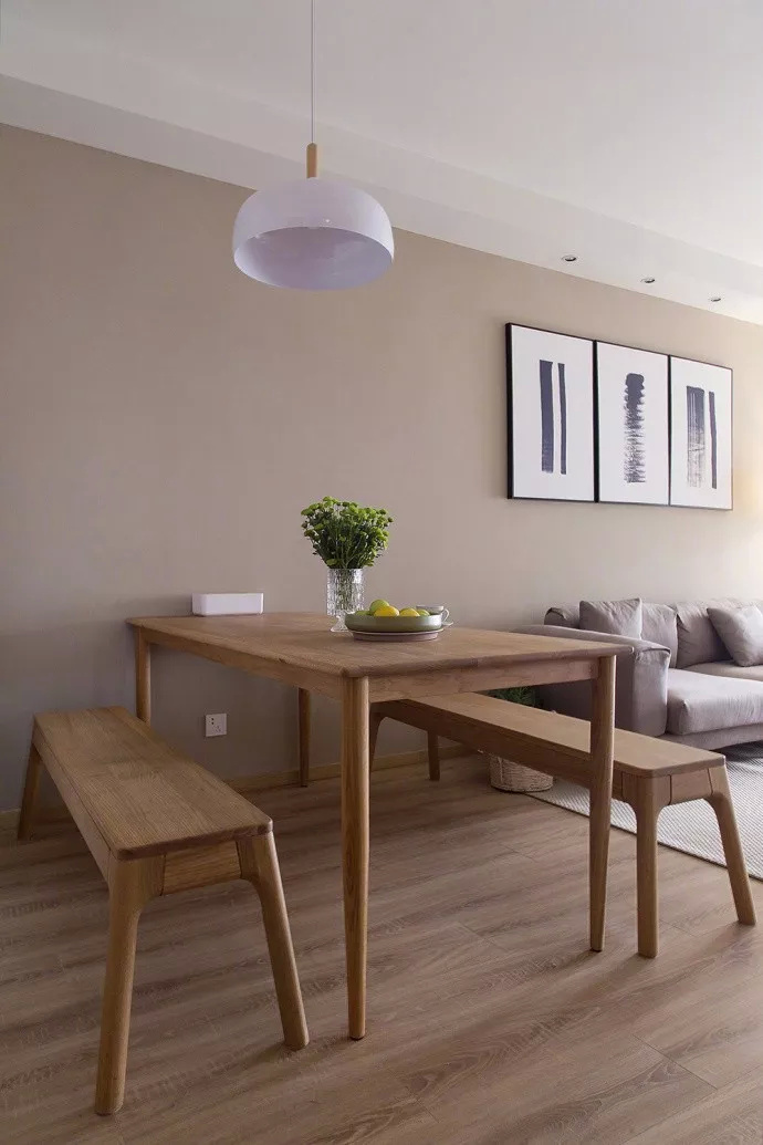 ▲餐厅是非常简约的原木风,却能带给人一份安逸和温暖,长条椅取代餐椅,不仅能让多人同时就餐,还能让大家都挤在一起,更显亲密和氛围感,充满清新的小绿植让餐厅充满无限生机。