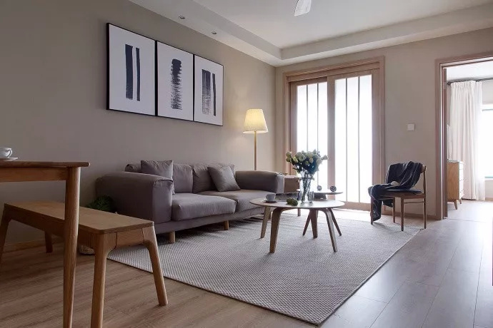 ▲餐厅之后就是客厅,北欧普遍的灰色系沙发搭配原木小茶几,尽显舒适宽敞的居住环境,落地灯散发着柔和的光晕,让人忍不住想窝在沙发上挑灯夜读或者静静看一场电影。