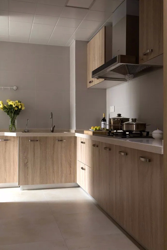 ▲厨房直接顺着转角处设计L型布局,尽显厨房的静、深,原木橱柜搭配浅灰色墙砖,极致的休闲和温馨,厨房也可以很优雅,灿烂张扬的暖黄色鲜花给人极强烈的视觉刺激,仿佛心情都开朗了不少,温暖的阳光射进来,满室亮堂静美。
