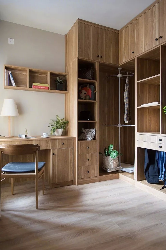 ▲这里是书房和衣帽间两大功能区的汇聚地,满屋的原木衣柜满足你买买买的欲望,原木书桌搭配同色书椅,简单自然,一盆绿植用来缓解眼睛疲劳,多么棒的布置。