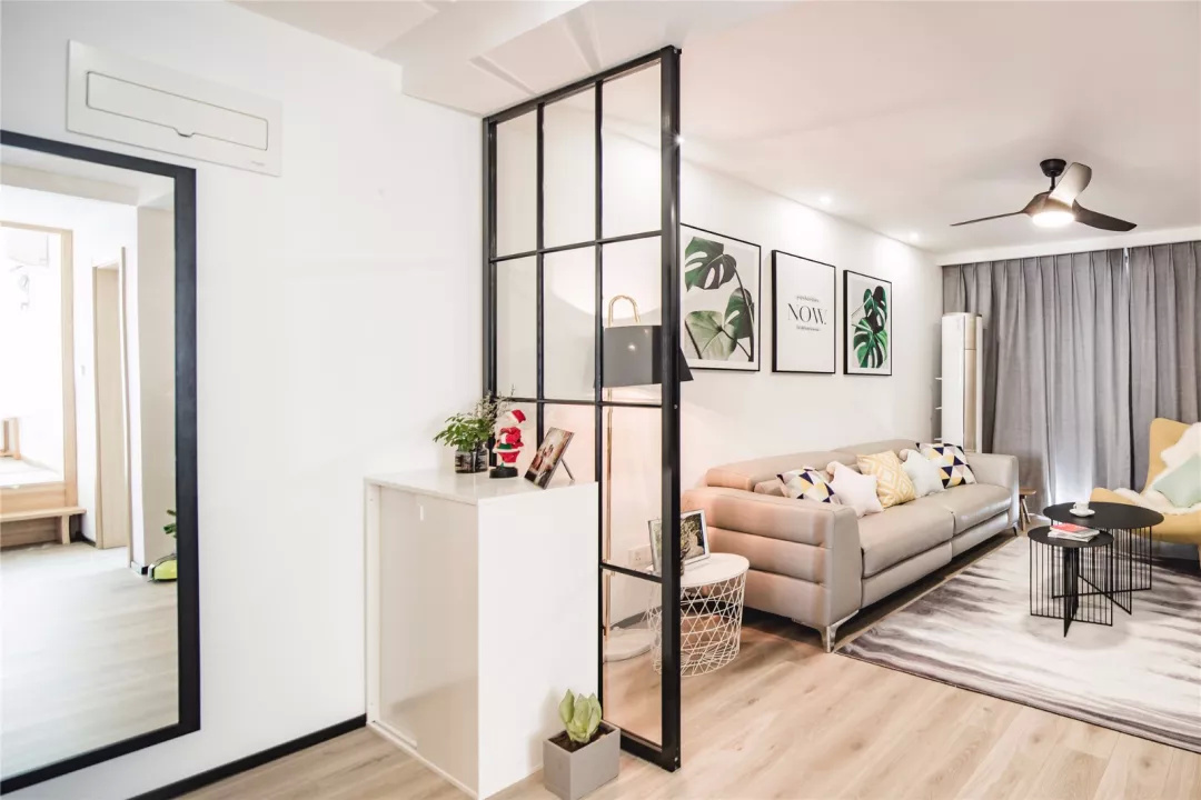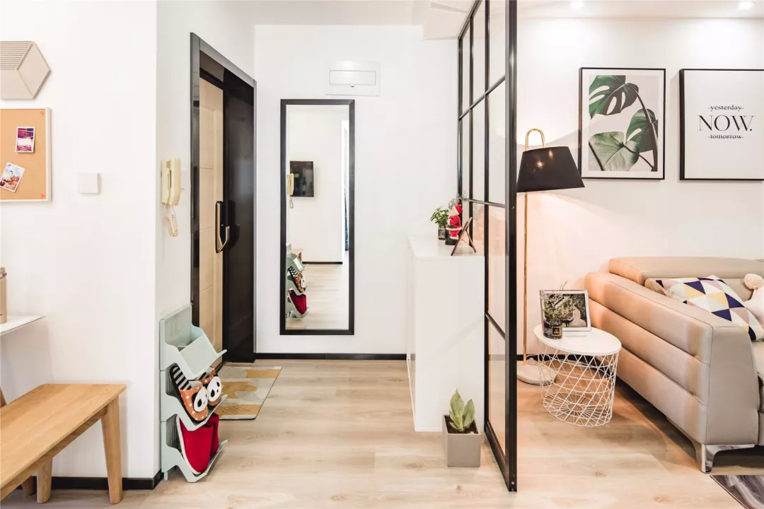 ▲鞋柜后是与客厅进行划分的黑框玻璃隔断,为客厅空间提供隐私感,同时又让空间显得更加时尚大方。