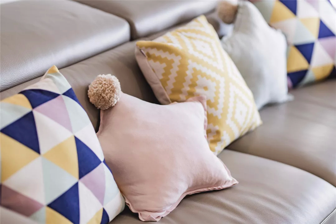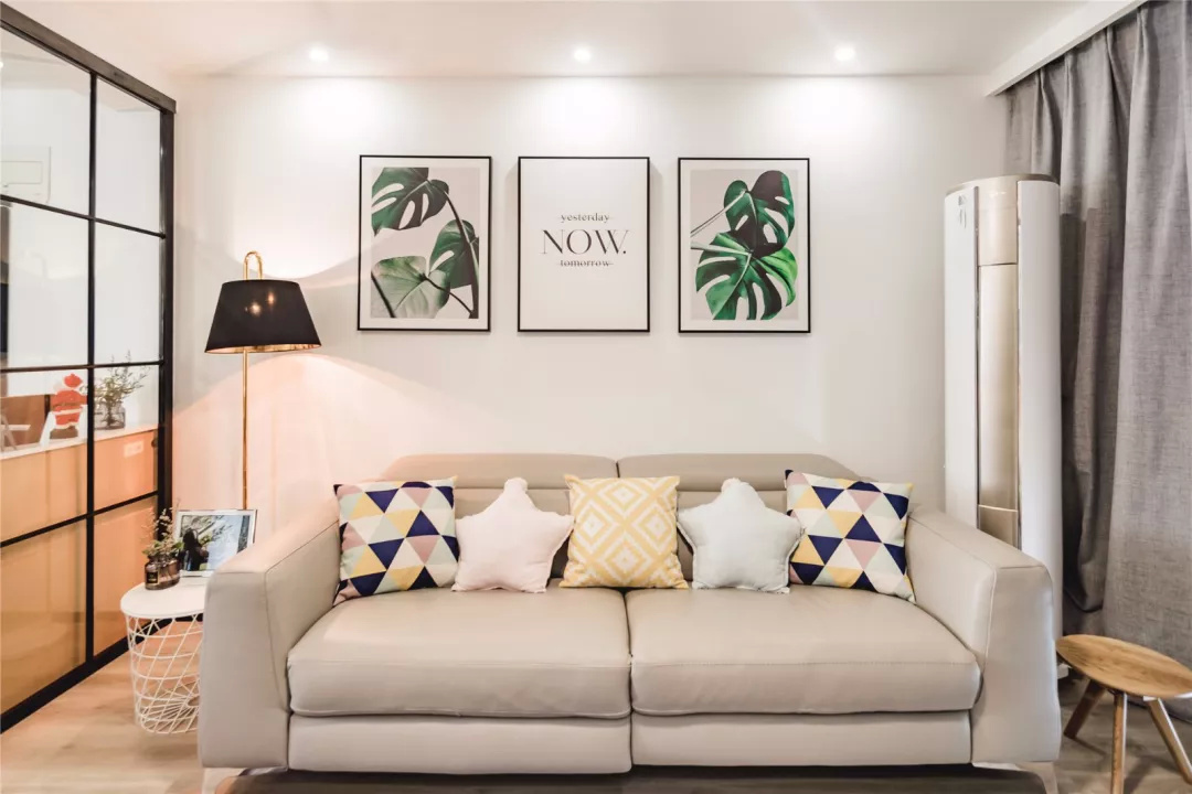 ▲干净的大白墙,沙发墙上几幅植物装饰画,搭配舒适柔和的软装,灰白的主色调中交织着绿色、黄色的活力,带来了时尚活力的视觉魅力。