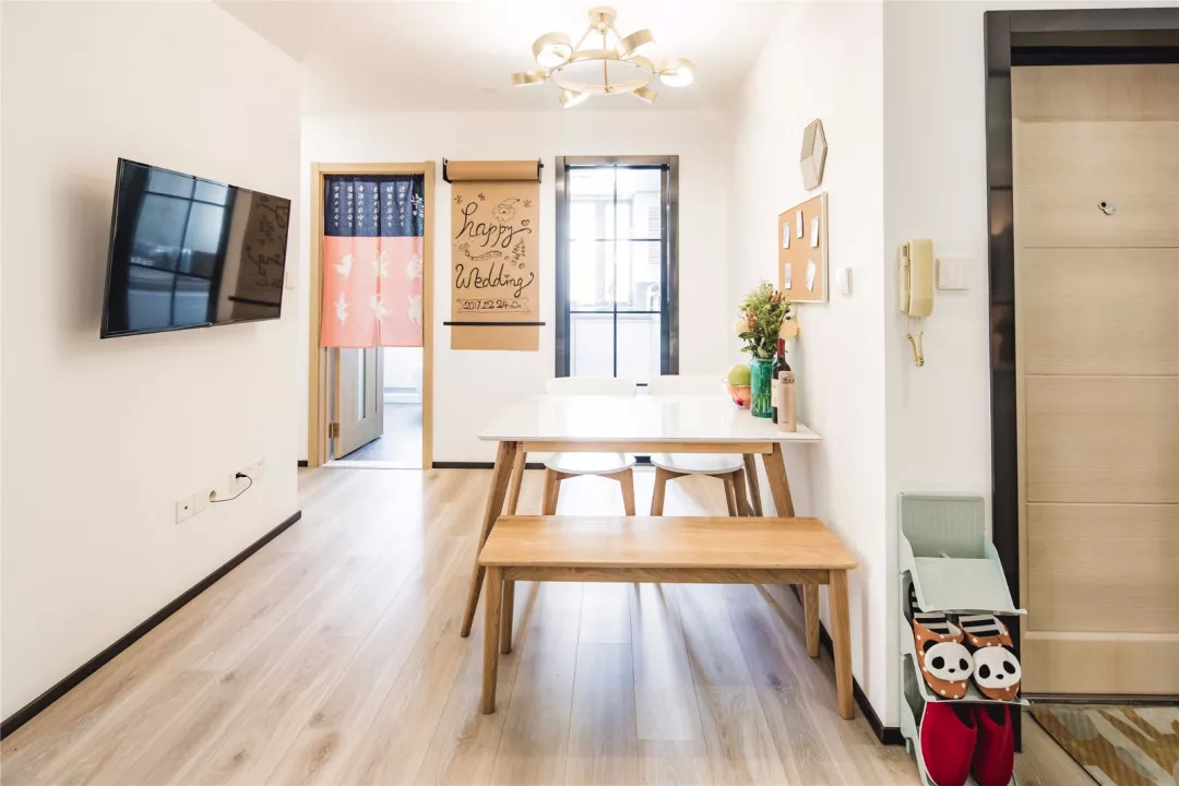 ▲进门左侧是一面全身镜,右侧是一个拖鞋架,餐厅的长木凳可以充当临时的换鞋凳,提供了无微不至的使用体验。