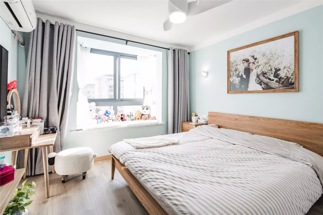 ▲淡蓝色的墙面,配合一幅婚纱照,散发着简单清新的温馨感。 布满玩偶的飘窗,一张小羊梳妆凳,都在诉说着受人宠爱的幸福美满。