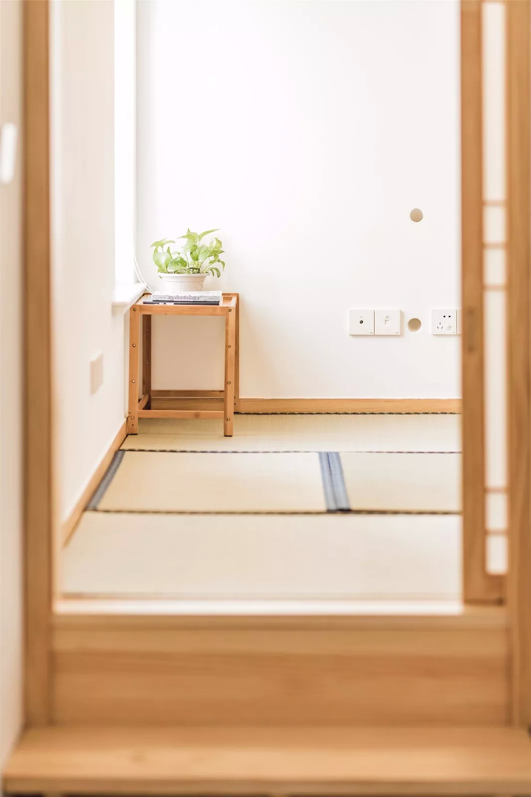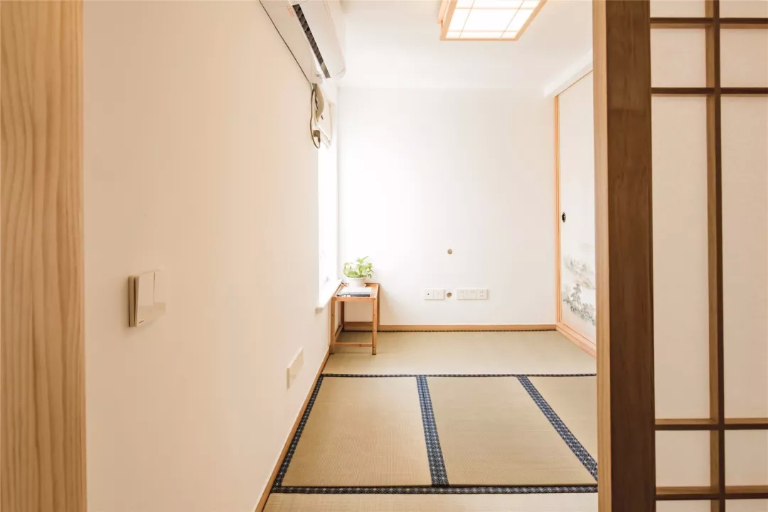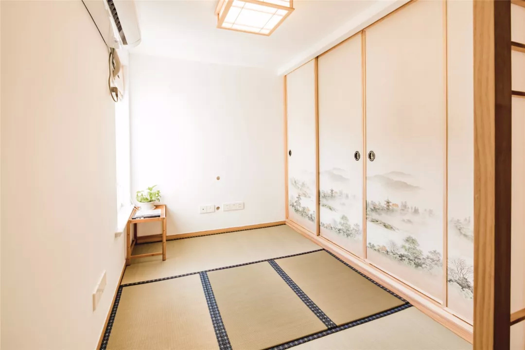▲客卧是榻榻米的布置,配合柜门朦胧的意境山林画,天花的原木框吊灯,打造了一隅淡雅与静谧并存的禅意空间。