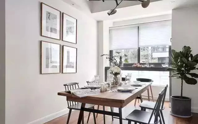 ▲餐桌是非常常见的,也是最流行的原木色,一张餐桌、四把餐椅,开启一家人凑在一起吃顿饭的美妙时光,用素雅的小百花做点缀,让餐厅更不止有温暖,还有优雅。