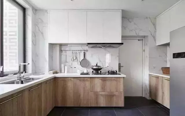 ▲原木橱柜,大理石墙面,让厨房一尘不染,凭添质感,宽敞的空间,随处可见的橱柜和置物架,让厨房尽用品统统收纳。