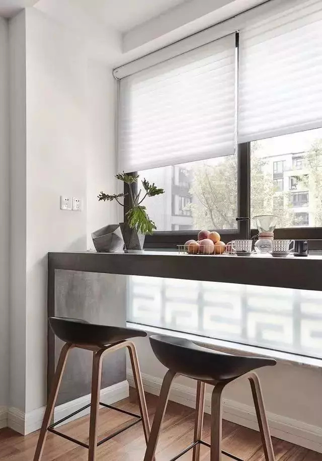 ▲餐厅靠窗的位置充分利用起来,一张长形案板,两张高脚椅,打造平时读书,看书,喝酒;赏景的小角落,还能让温热的阳光照在懒洋洋的自己身上。