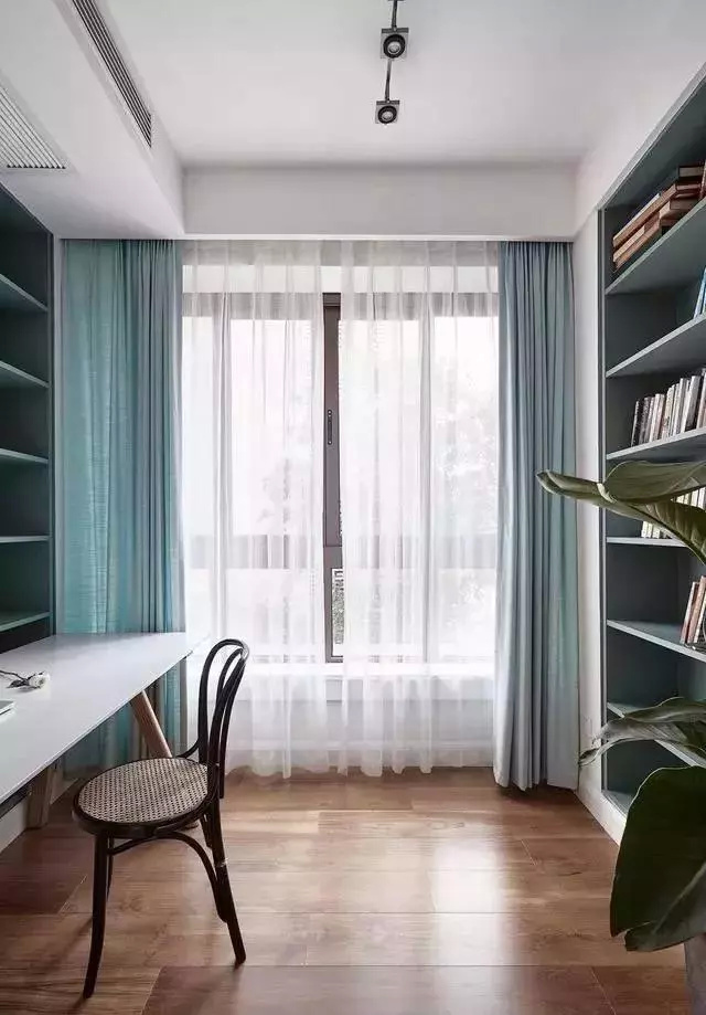 ▲嵌入式置物在有限的空间内得到最大的发挥,白色书桌在温润质地的原木地板上静静放着,窗外是大片阳光和好看的景色,而你就坐在这样的环境里,或思考、或写作业、或看书,这样的场景,怕是想想就感觉很知足,幸福。