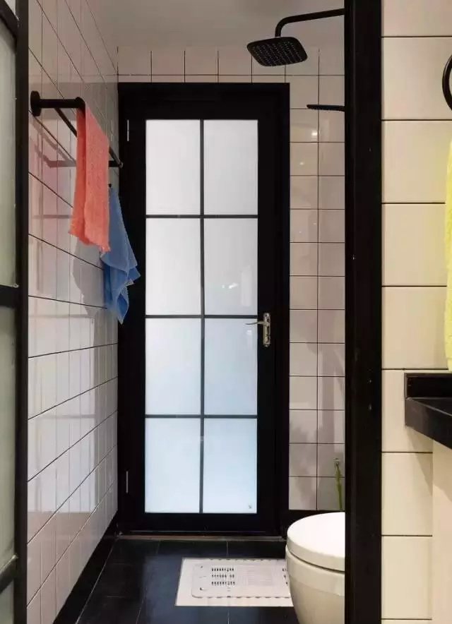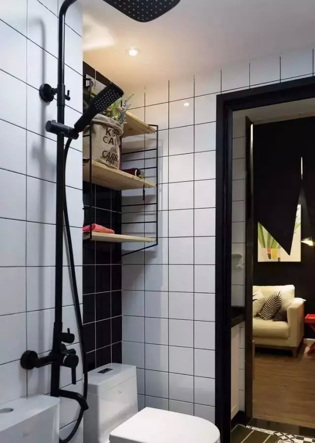黑白的小方砖充满了北欧色彩,特意选的黑色淋浴花洒很好的形成对比,搭配上实木隔壁,好看又实用。