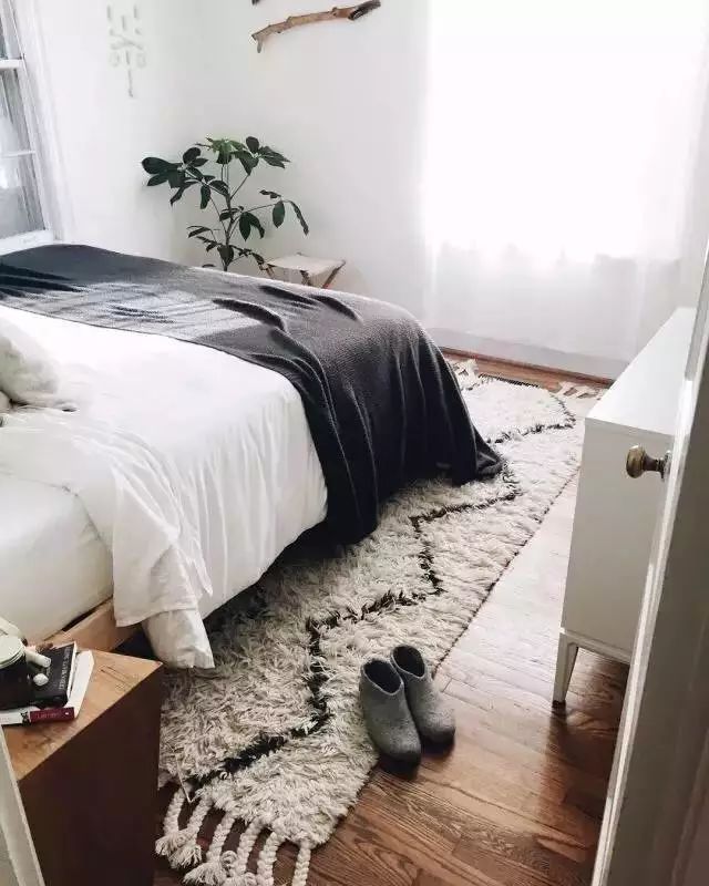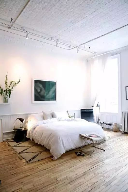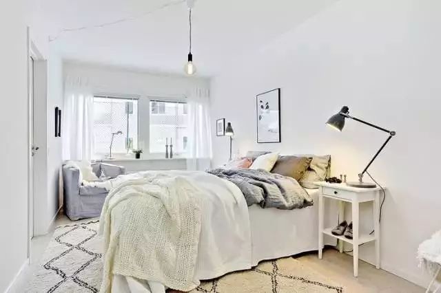如果你想要一个纯净的卧室,那么白墙+白色床品+白色窗帘肯定是不二之选,在休闲毯、靠枕、腰枕上面做一些小文章,你就能拥有一个绝对纯粹的北欧风卧室