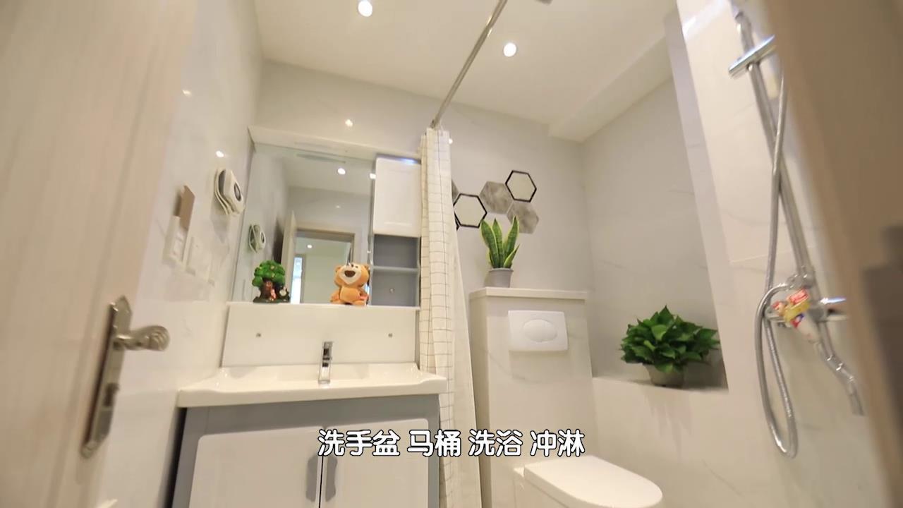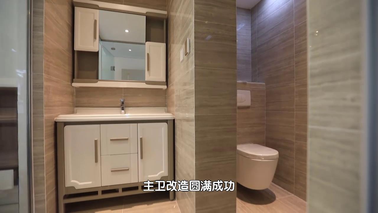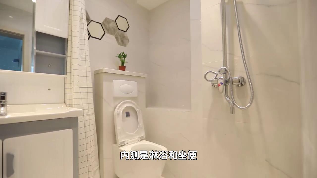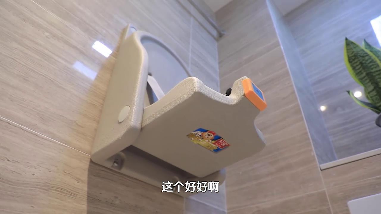 不过要说整个房间改变最大的,还是这个玻璃墙的卫生间。由于设计师将原有卫生间向主卧推了1米的距离,所以整个卫生间整整有4平米,而且细心的王勇还将卫生间划分为2平米的洗浴如厕部分,和外侧2平米的洗手池部分。原来细心的设计师为了方便王偲看孩子,在厕所也做了可折叠的宝宝椅。主卫改造圆满成功,可是另一侧的卫生间是否会变得很小呢?设计师将卫生间用一道浴帘隔成了干湿分离的两间,外侧是洗手池,内侧是淋浴和坐便,既简洁大方又便于清理。 暖暖的新家