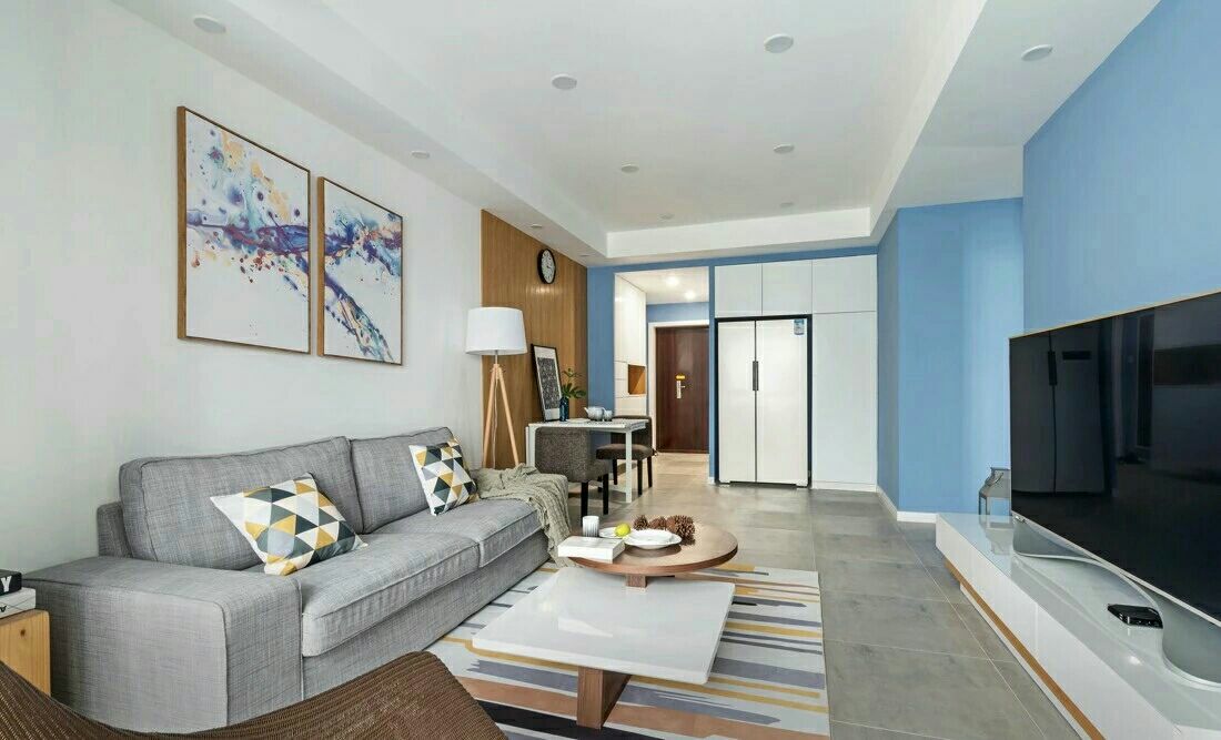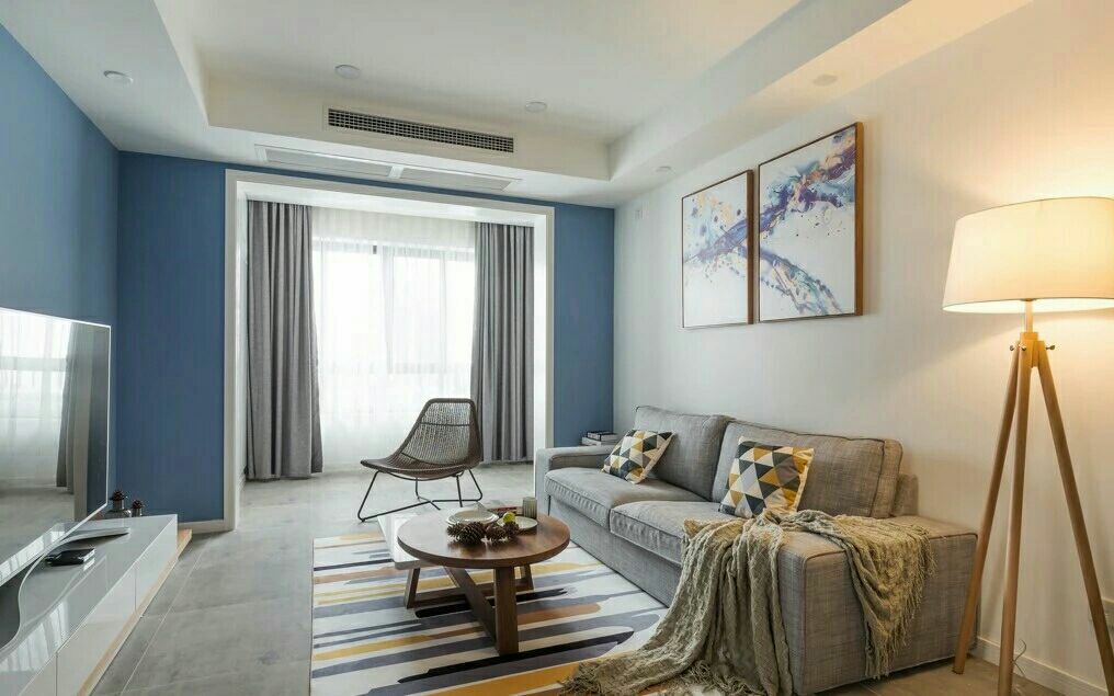 客厅墙面通过白色与灰蓝色的经典搭配营造出现代简约的理性之美。