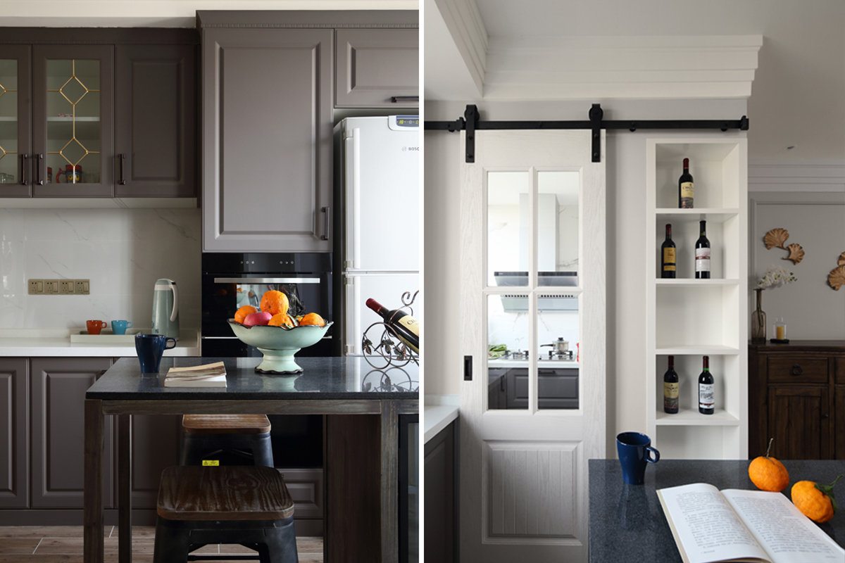 开放的空间,客餐厅看起来很宽敞,可操作的空间很富裕,平日里朋友来聚餐也不显拥挤。为了节省空间采用了谷仓门,而谷仓门一边是酒柜,就像是一个隐藏的柜子般,设计师的用心很巧妙啊!