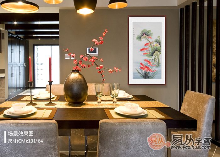 王一容四尺横幅荔枝鱼《红荔九鱼图》自古九为至尊亦有长久之意,水为财,鱼寓万事如意;九条鲤鱼在水里游来游去,象征着生意上的“如鱼得水”。“鲤”的发音与“利”相同,所以鲤鱼也用来象征生意中收益和盈利,在办公室挂一幅红荔九鱼图还有“鸿运当头”的含义,是招财旺运势的神器。中国人为何喜欢挂九鱼图呢?1、寄托心理愿望,传承“鱼文化”!玄关挂九鱼图,由来已久。中国人特别喜欢寓意吉祥的图案,“鱼”便是其中之一,并且给鱼注入了丰富多彩的民俗文化内涵。因为鱼与“余”是同音,人们把对生活美好,衣食有余的心理愿望寄托于它。从“除夕之鱼”到“装饰图案”,无不透露着中国博大精深的“鱼文化”。2、文化渊源深厚,尽显修养品味!“九鱼”是从“九如”演绎而来。“九如”出自《诗经》:如山、如阜、如冈、如陵、如川之方至、如月之恒、如日之升、如南山之寿、如松柏之茂。每一个“如”都是吉祥之物,所以九鱼图中,每一条鱼都代表着其中一“如”,这便是“九鱼图”的文化渊源!