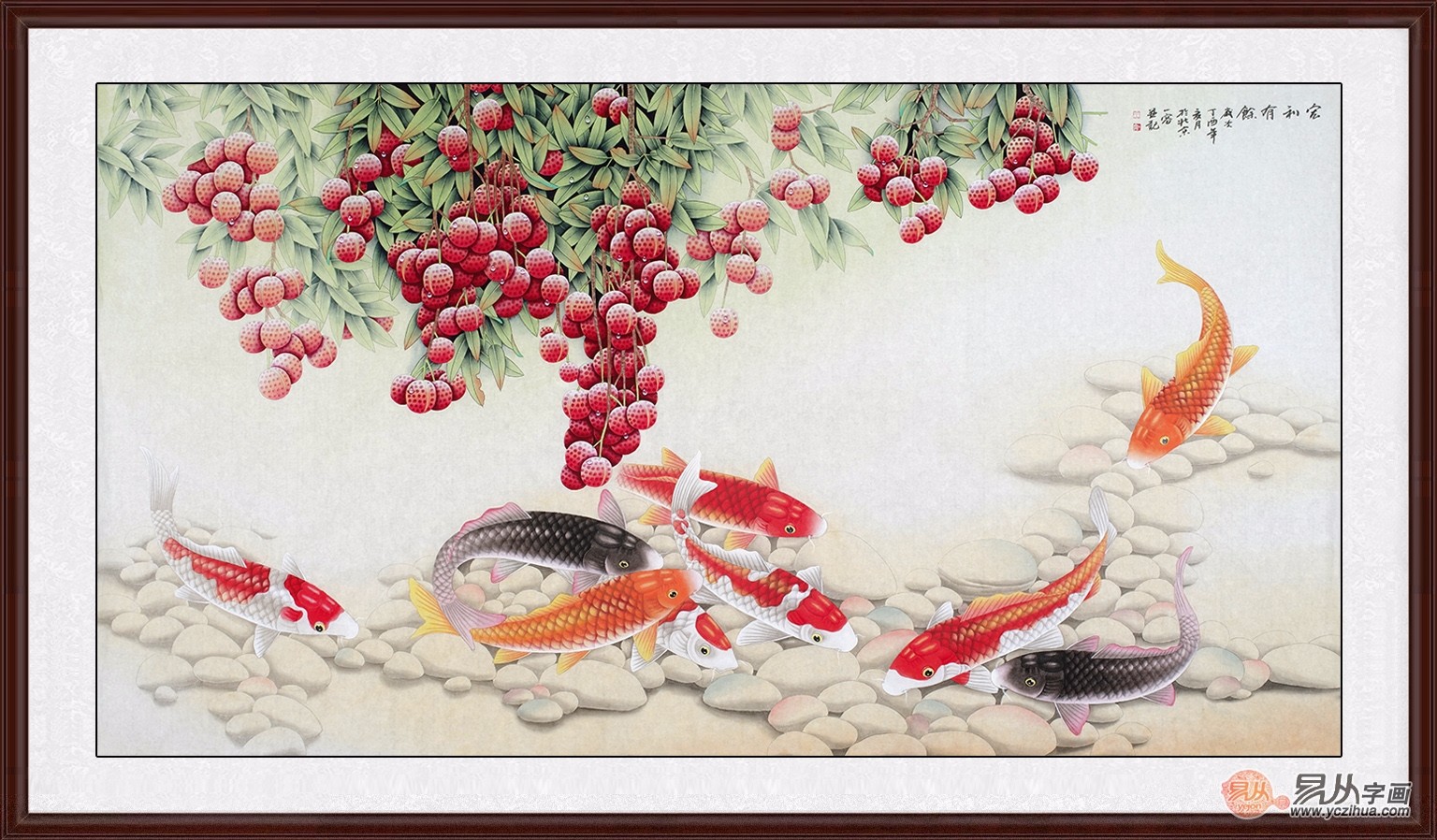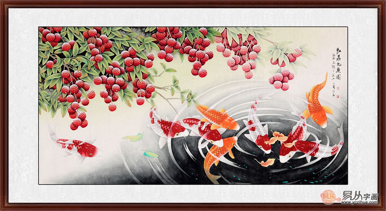 王一容新品红荔九鱼图《宏利有余》“荔枝鱼”是中国传统文化中最为吉利的代表,荔枝形态优美,四季常绿,象征欣欣向荣;生命力强,可生长百年以上,长盛不衰;荔枝音同励志,是常见风水吉祥物。图中“鱼”的发音与“余”是同音,代表年年有余。鱼在民间寓意喜庆祥和,我国自古就有“鲤鱼跳龙门”的传说,人们用鲤鱼祝福年年有余,事事康宁。二、玄关挂九鱼图:招财纳福,折煞挡煞