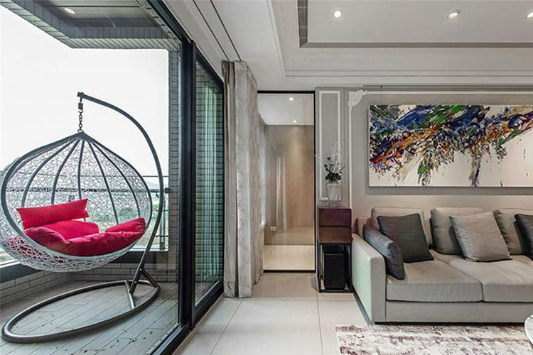 客厅淡雅的素灰色主调和家具软装打底,电视墙采用同为灰色系的斑斓质感大理石,并放弃大型吊灯,采用整齐排列的小灯营造光源,提升空间整体的质感和格调。沙发靠墙采用了本案例的亮点设计——长幅图腾装饰画,确立了古典格调的家居氛围。