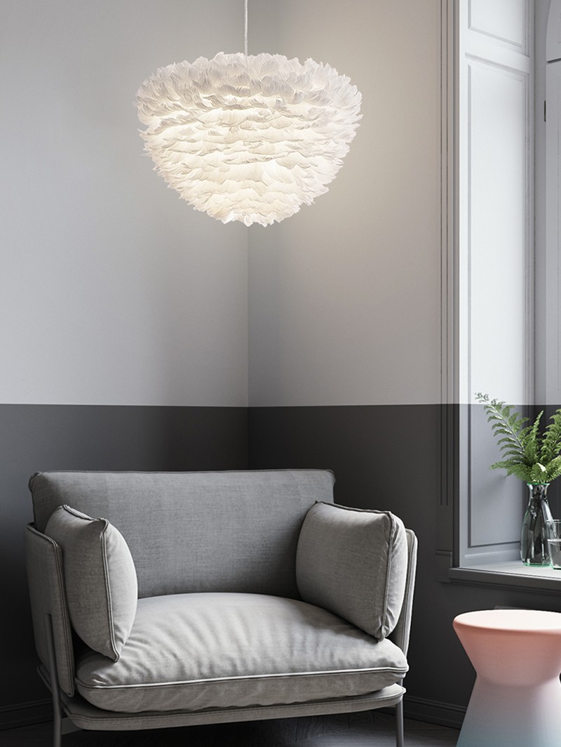书房整体以灰色为主,深色不会让学习工作分心,书房放置的小沙发除了阅读方便,还可以小憩一下,羽毛灯的装饰让整个空间提亮,也让家居环境活泼了不少。客厅