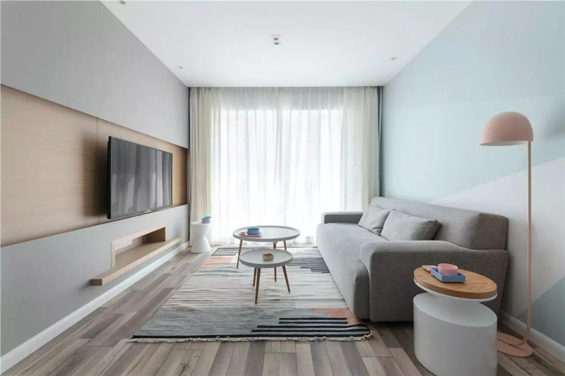 客厅也延用了纯色为主,自然大气中也不失一丝俏皮,原木色的电视背景墙可以舒缓疲劳,可以在客厅彻底地放松下来。