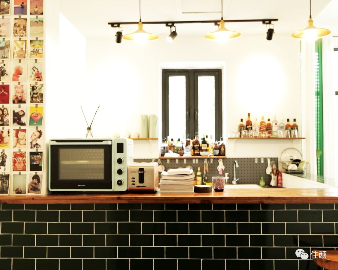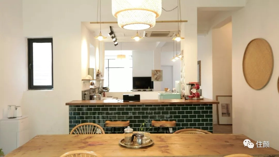 张欣然为了将厨房和客厅巧妙的融合在一起,用了和客厅窗帘颜色一样墨绿色瓷砖贴面做矮墙,并将其围成了相对独立的厨房区域
