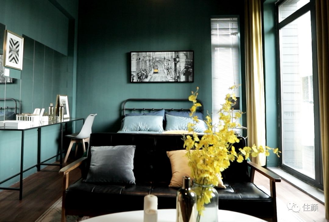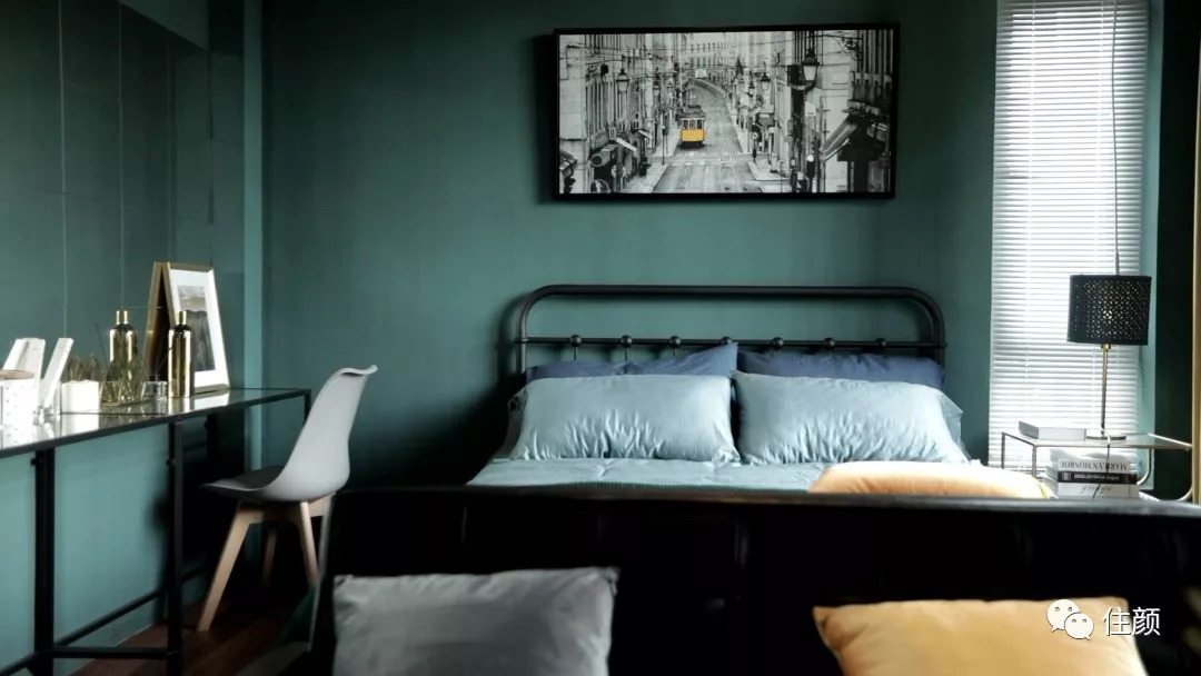 从一层的四白落地,到二层卧室的浓重色彩,虽然看起来变化很大,但也有千丝万缕的联系,比如卧室用大面积的墨绿色作为墙面,和一层客厅的窗帘、矮墙相辅相成,姜黄色软装的点缀,让卧室复古又灵动