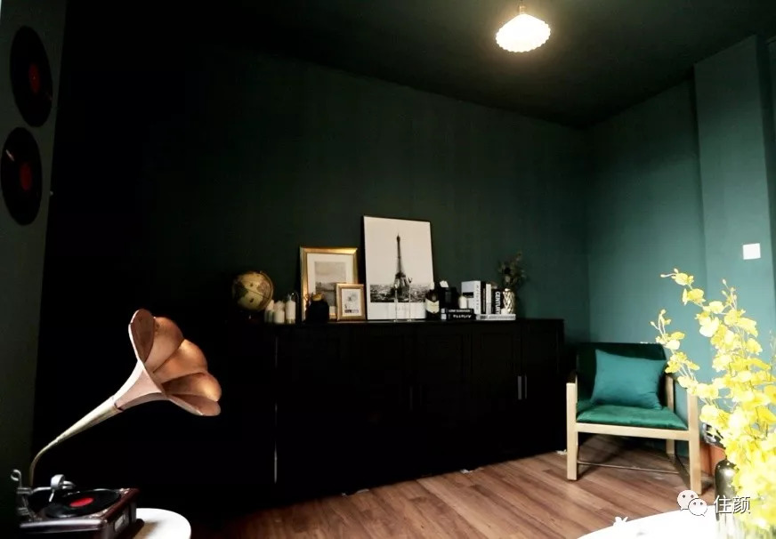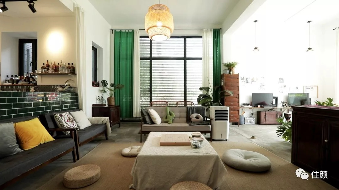 在阳光区域,木质的灰色布艺沙发,二手淘来的带有年代感的陈旧储物柜,搭配亮眼的墨绿色窗帘,有种中式复古的混搭风,也能看出屋主随心所欲的态度