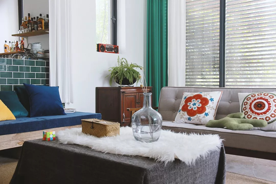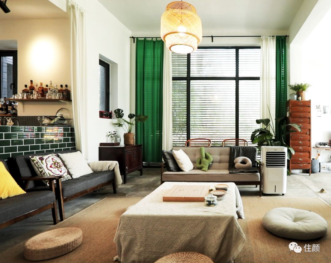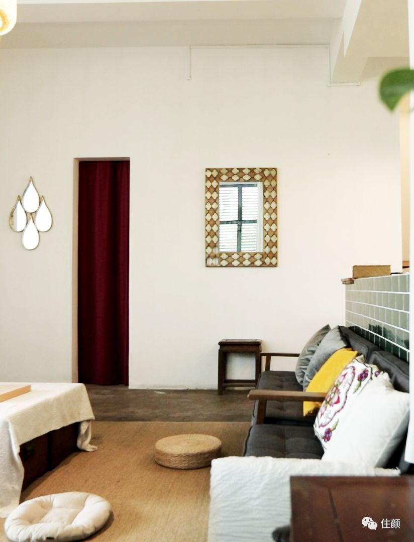 大块的亚麻色地毯将客厅的中心区域完美的划分出来,中间的茶几是个老式木箱,张欣然将白色桌布铺上后,与地毯能很好呼应,不觉得突兀,地毯上随意摆放的草编蒲团,不管多少朋友来了都可以随地而坐