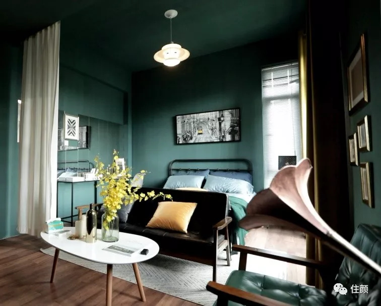 卧室也分为两个区域,床与沙发之间用一帘白纱相隔,靠床边有一面镜子,扩大卧室空间,而黑色的中古皮沙发与黑色的五斗柜相互呼应,摆在茶几旁的老式留声机更让卧室笼罩一种浓烈的「高贵复古」气息
