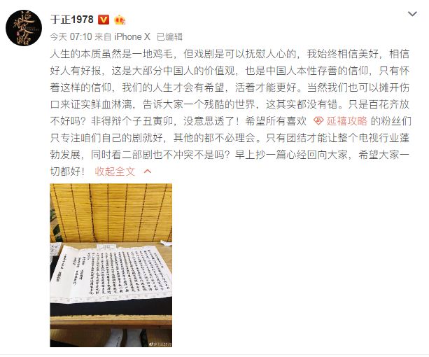 这些热火朝天的网友喷子,把《延禧攻略》的导演于妈都吸引过来了,赶紧来“劝架”,他表示:只是百花齐放不好吗?非得辩个子丑寅卯,没意思透了!希望延禧粉专注自己的剧就好,其他的不必理会