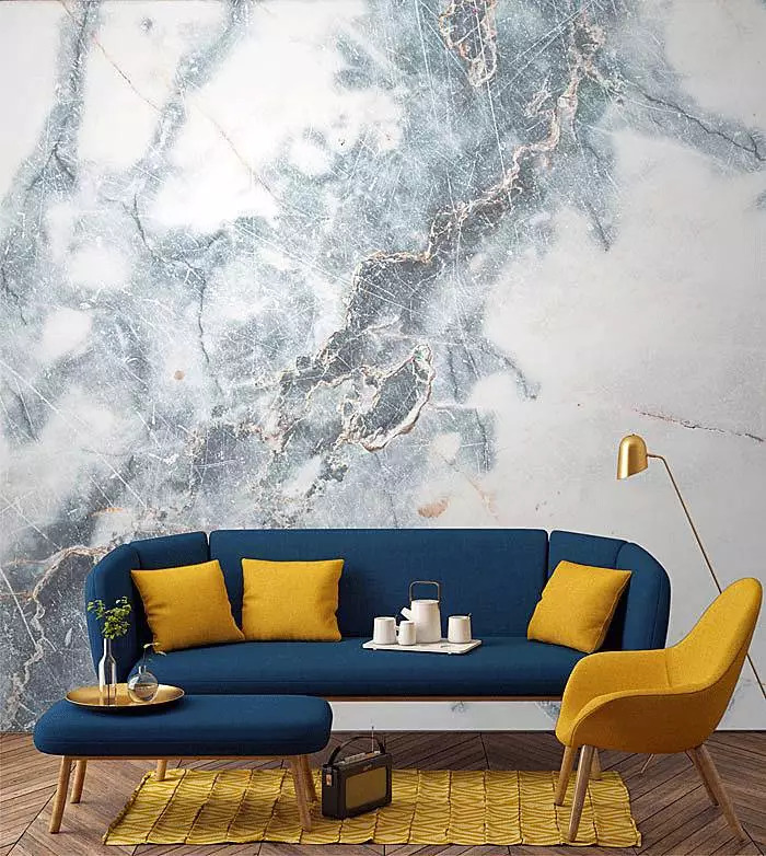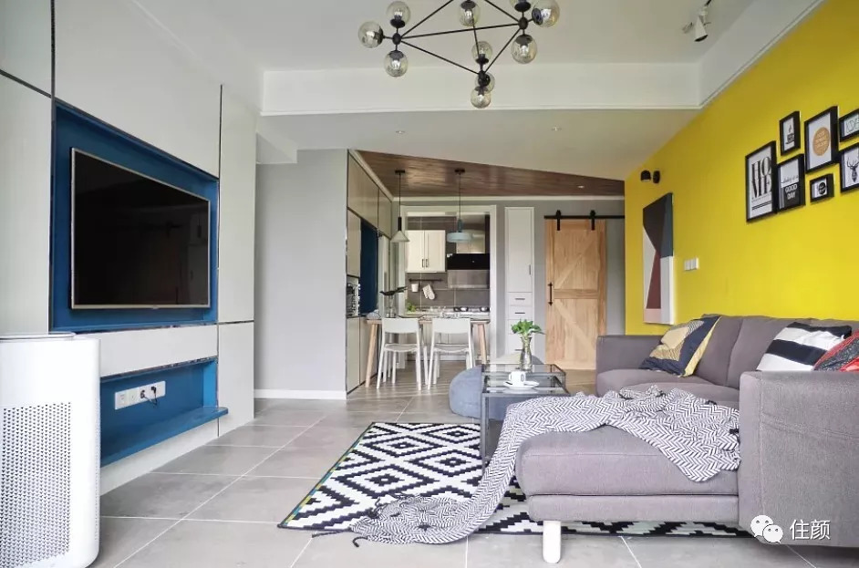 如下图的客厅设计,墙面是属于冷色调,而蓝色沙发和黄色靠垫的撞色搭配将整个客厅提亮,让客厅更有层次感,冷中有暖