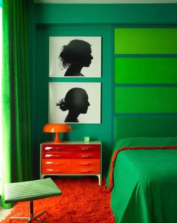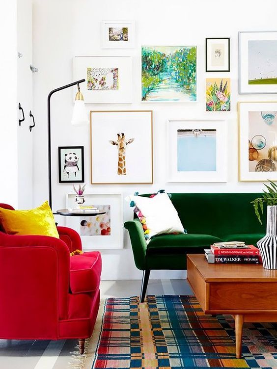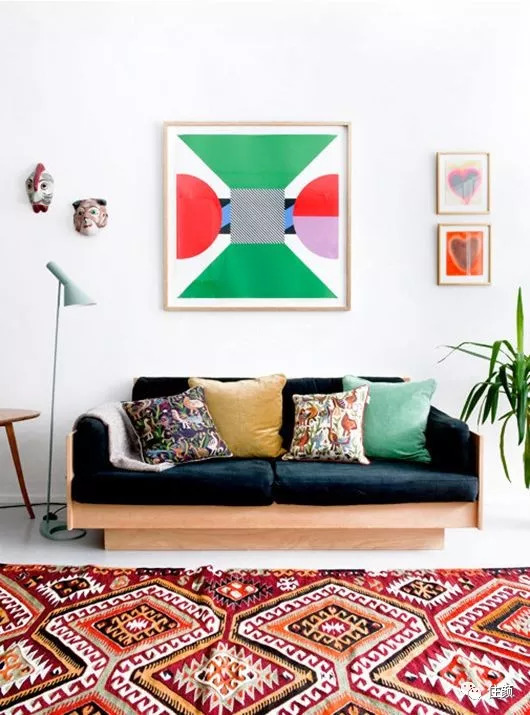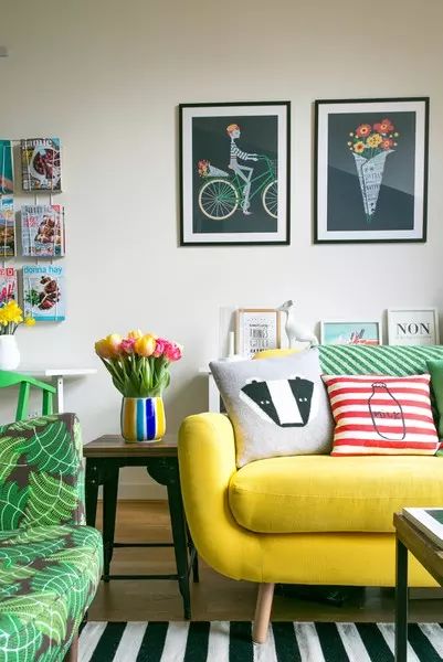 所以,我们可以选择利用纯色进行过渡,比如红绿家具搭配,以白色的墙壁画做点缀,弱化大红与大绿带来的浓重感
