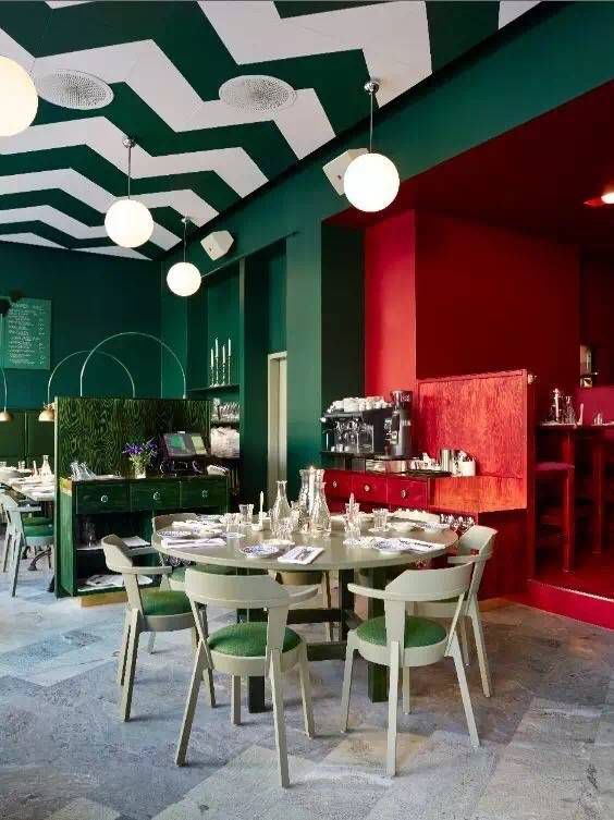 如下图的餐厅设计,墙面颜色以绿色为主,用红色做点缀,为了中和强烈色彩,餐厅使用了灰色地砖,灰绿色的餐桌椅让地砖和墙面完美过度,让这个餐厅变得不那么刺眼反而很和谐