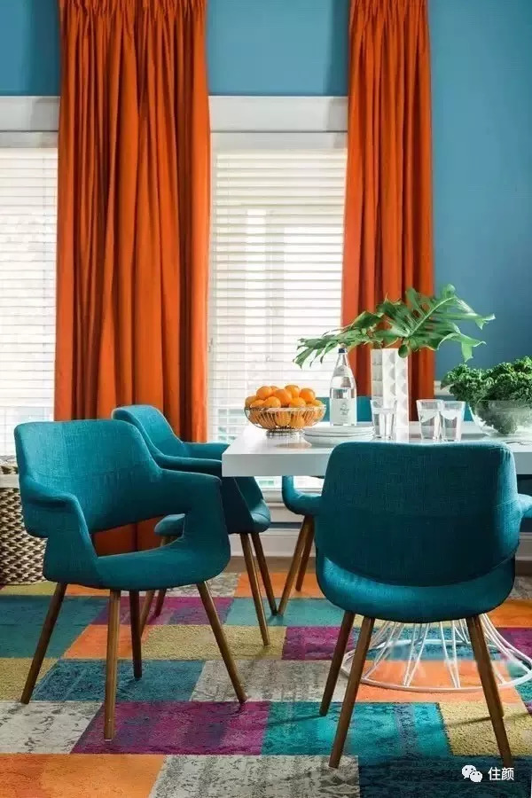 大面积撞色,黑白原木来协调那么颜姐建议你将互补色的比例调整为一个大面积出现的颜色,一个作为点缀色,并且适当使用自然的原木色、 黑色或白色进行调和