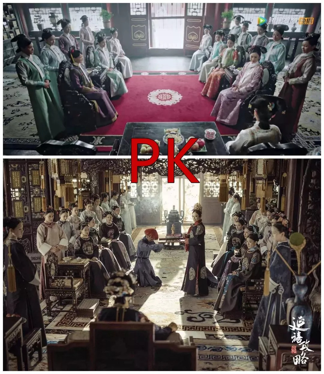 宫殿装潢来Battle《延禧攻略》中的地毯,以灰色和米色为主,与深色的古朴家具搭配很和谐,并显得大气稳重,而《如懿传》里的红色地毯虽然很亮眼,但过于突兀,颜姐只想问一句:开始唱戏了吗?