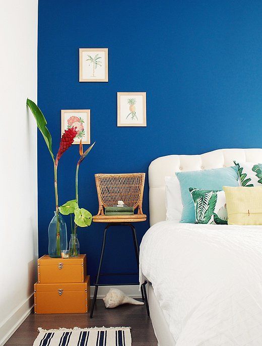 把蓝与橙色的撞色用到了极致,蓝色椅子加墙面与窗帘奠定了色调基础,而地毯上的色块也在持续着这种视觉上的跳跃,有始有终,加上百叶窗的大面积白色,留足了呼吸的空间