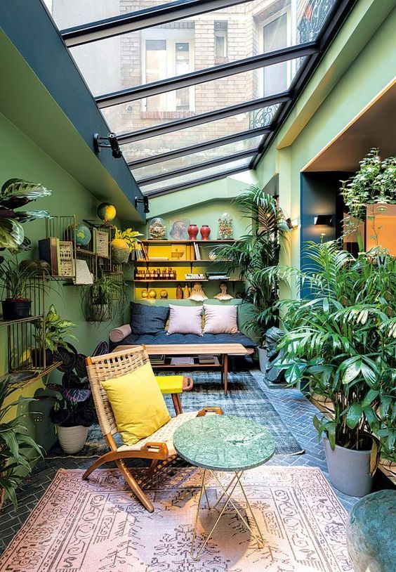 阳台比较适合这种绿色墙漆,更适合和绿植搭配一起,一点都不显得突兀,但本身绿色是冷色调,所以用黄色软装来提亮,中和了整体空间的平衡感,让阳台更灵动活泼
