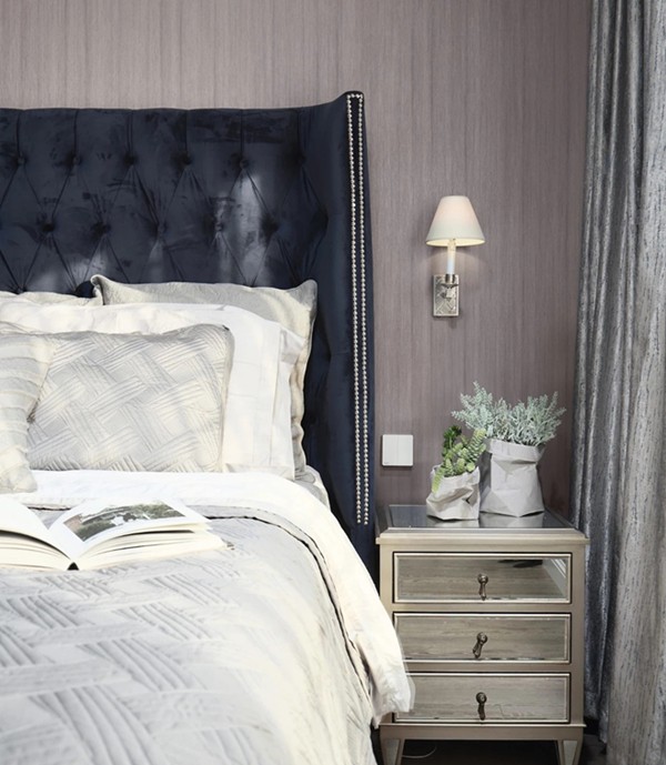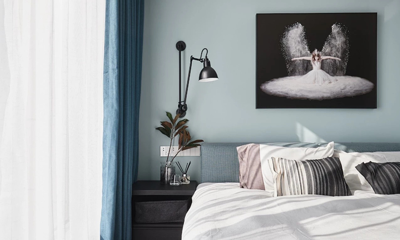 二、床头灯床头灯有很多种类型,壁灯、吊灯、台灯、落地灯,款式也各种各样,除了承担基础的照明工作,也承担着装饰美化的作用。如果有阅读习惯的话,还要考虑是否适合夜读,会不会影响到另外一边等等。1、壁灯相对于台灯的好处是不需要占用床头柜的台面位置,可以让床头柜的利用率更高,另外对于床头背景也是一种装饰。