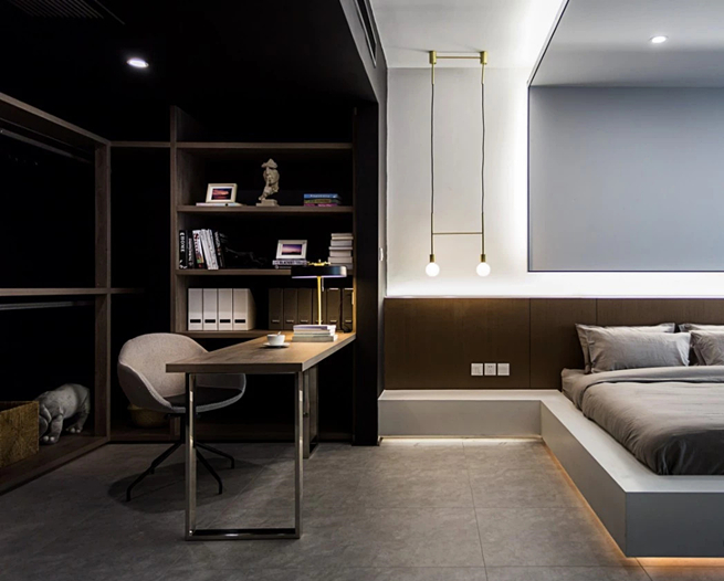 2 、床头本身做出来一定的宽度,上方可以置物,床边的格子、床上的隔板都可以充当床头柜功能