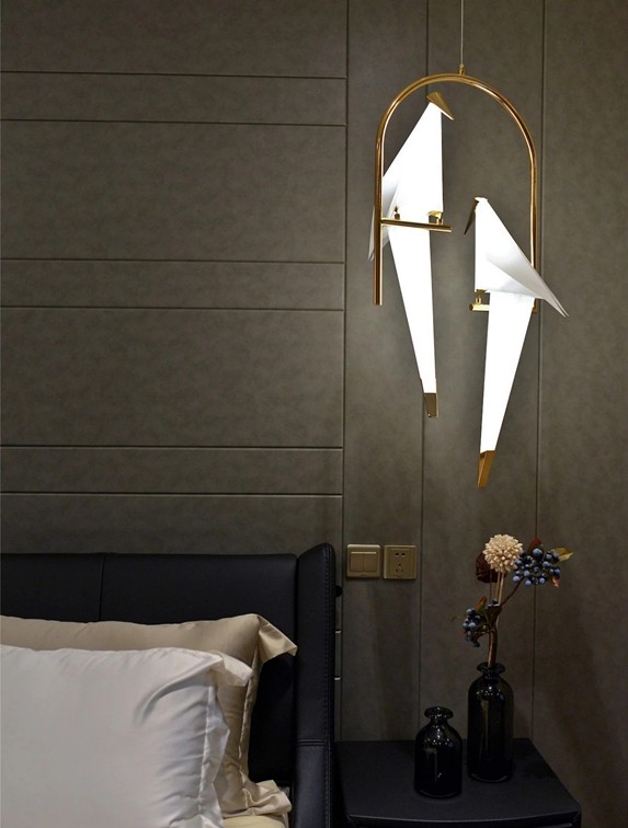 吊灯有各种各样的形态,是卧室的颜值担当,也有人不对称设计,一边是吊灯,一边是壁灯。