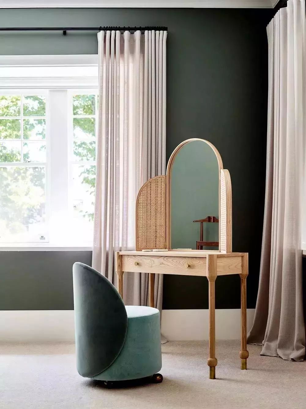 简约纯粹的白,天然实木的质感,再注入一抹淡雅的灰豆绿,就能带来一个极简的生活美镜