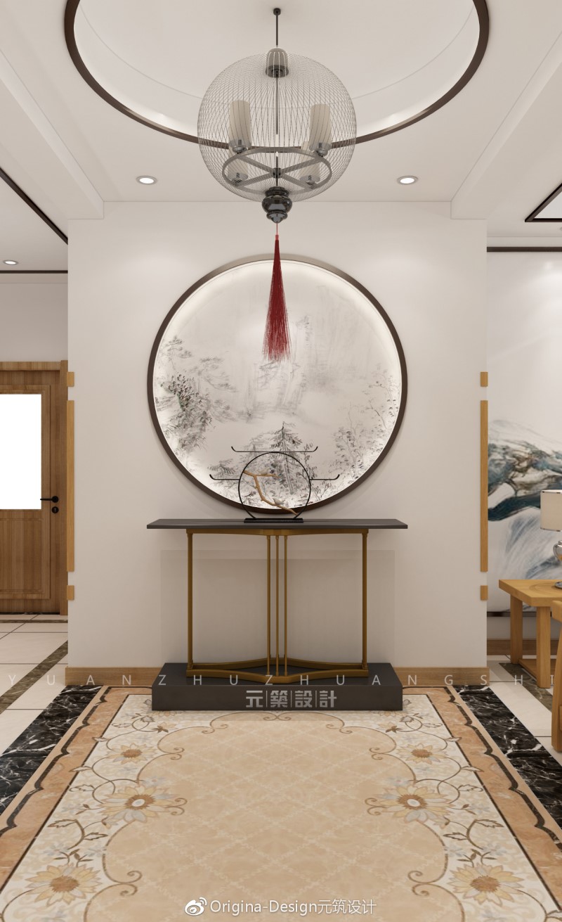 进门玄关是一种景致,预示着一种心情,也就变得格外的重要。圆,山水画,竹灯都是中式风格的重要元素。将山水画与圆的灯带相结合,更是别有一番风味了。客厅