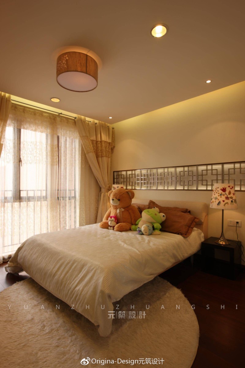 以女孩的独特视角出发,阳光、明亮而不失童真。吊顶中隐藏的灯带和射灯,以及床头墙面设计的中式镂空花格,散发着柔和的光线,烘托出灵动梦幻的空间氛围。男孩房