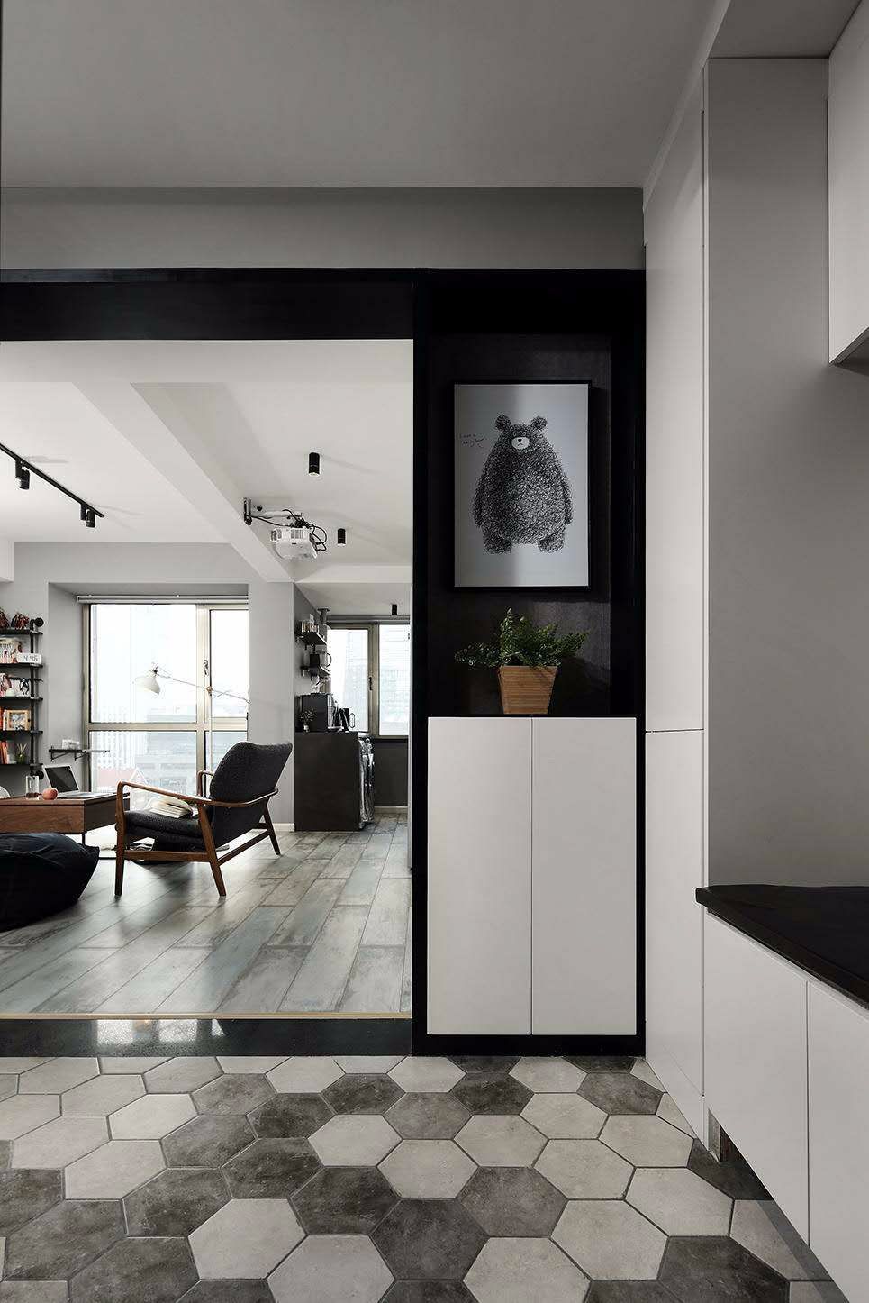 进门正对面做了一小面的地柜,一是为了与玄关柜保持平衡,另一方面也避免了一进门就将室内空间一览无余的尴尬